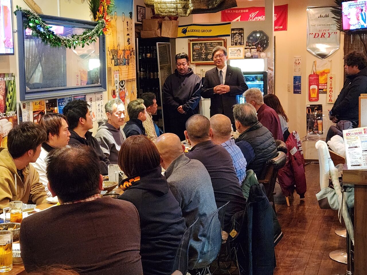 後援会青年部(青田一宏部長)忘年懇親会に参加しました。私の留守をしっかり守り、忙しい仕事の合間、ポスターを貼り、各種行事に汗を流してくれる頼もしい同志の皆さんです。久しぶりにゆっくりお話しができました。亡くなられた鈴木基司市議の時代から選挙区が変わってもこちらで活動していただく青年部も大勢います。先日には長谷川市議の市政報告会が上柚木で行われ、選挙区外ではありますが私も出席し、基司さんを偲んで皆さんと結束を誓い合いました。