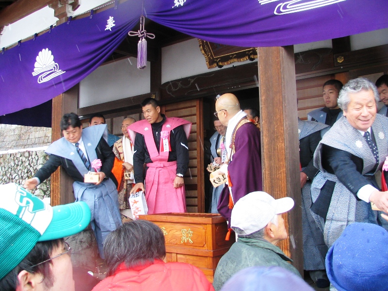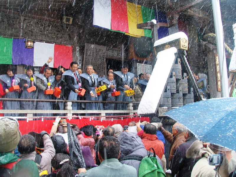 久しぶりの雪は節分を直撃した。前日の天気予報で確かに降雪と報じられていたが、帰宅時にはまだ疑いもあった。翌朝は車を乗り換えたり移動に時間がかかったりと、大慌てのスタートとなった。最初の節分祭は高尾山の薬王院。山頂は一面の銀世界でそれはそれはすばらしい景観だが、積雪は既に20cmを超え、来訪者は例年の1/10程。昨年観光ミシュランの三ツ星に数えられた事もあって、正月には空前の登山客を迎え出足好調だっただけに関係者はちょっぴり残念そうだった。ちなみに私含め八王子の政治関係者は冬場、姉妹都市である北海道の苫小牧市を訪問する事を経験する為、雪用グッズは充実している。私は数年ぶりにスパイク付のスノーシューズ、市長は通常の靴底にアタッチメントの滑り止め、議長は良く分からない?が滑らない靴で参加し、ケーブルカーの中では靴底を見せ合って盛り上がった。