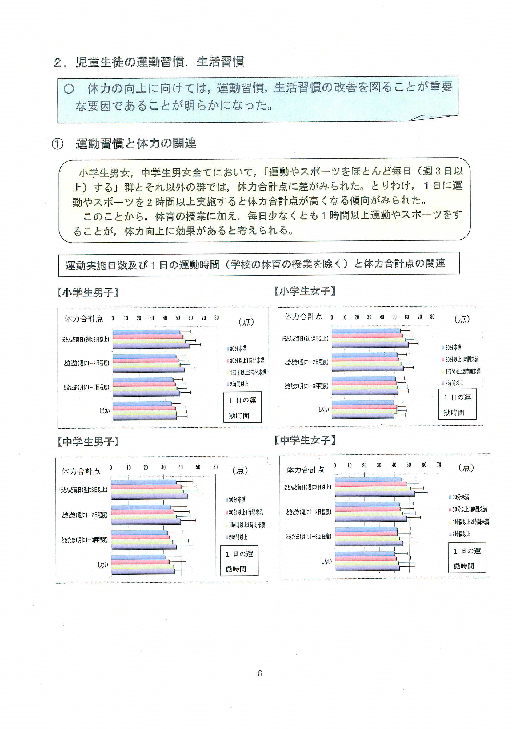 子供達の体力は間違いなく降下の一途をたどっている。体育の授業以外で全く運動しないという生徒がいるのもうなずけてしまう。しかし注目すべきは昨年話題になった全国学力テストの都道府県の結果と酷似している点だ。学力テストで上位だった秋田や福井は体力テストでも上位。高知や北海道、そして危機感をあらわにした橋下知事の大阪府がまたも下位になった。同時に行われた生活習慣調査に大きなヒントがある。上位に位置する自治体は「早寝・早起き・朝ごはん」と言った生活習慣が守られている子供が圧倒的に多い事だ。さらに内閣府の調査に照らすと、三世代同居が多い県と合致する。圧倒的核家族が多い都市部はライフスタイルも様々で、寝不足の子どもが目立つ。