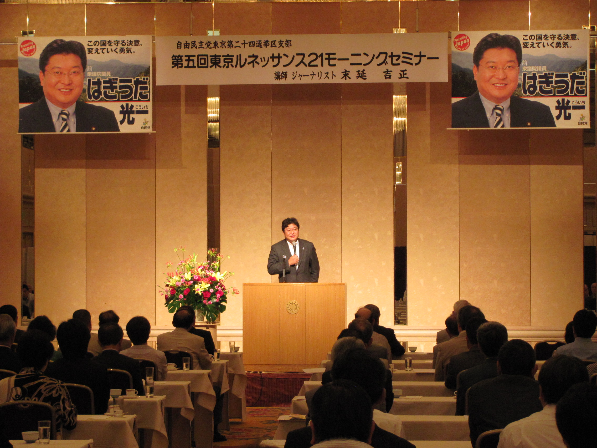 前日の東京ルネッサンス21モーニングセミナーには早朝から多くの皆さんがご出席をいただき、元テレビ朝日政治部長、やじうまプラス等で活躍の末延吉正先生が講師を務めてくれた。朝7時の八王子は大変だが、中大の特任教授として水曜の第一限目の授業を持っている縁も助けてくれ早起きを快く引き受けていただいた。本当は私や自民党とは距離のある朝日新聞の星さんやテレ朝出身の末延さんが次々にこの朝食会の講師を務めていただくのも奇縁だが、逆に報道の在り方等マスコミの裏事情や視聴者が報道の中立性や番組の是非をしっかり判断できるメディアリテラシーの必要性をわかりやすくお話いただいた。