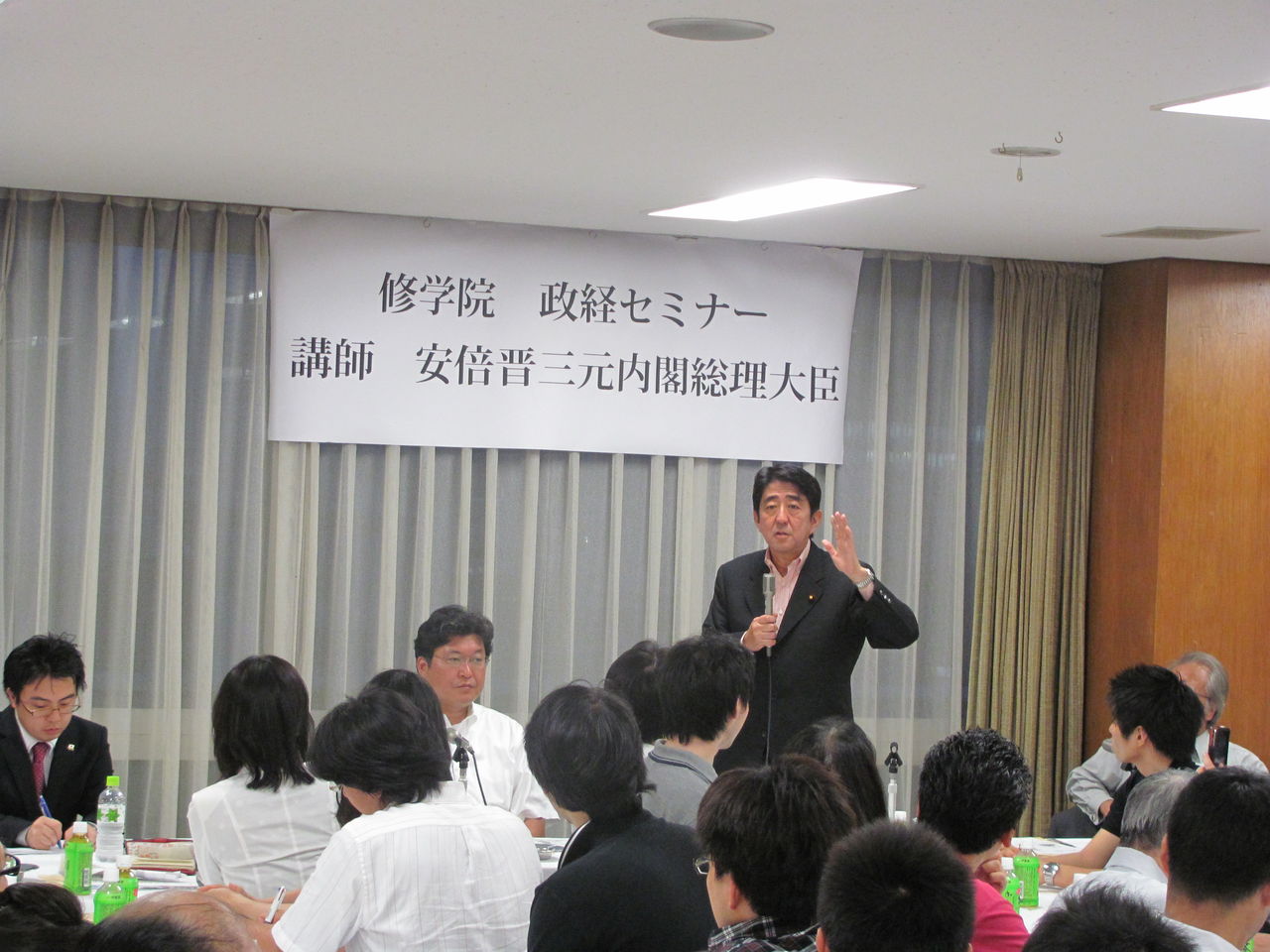 今年から塾長を務める事となったNPO法人修学院の政経セミナーは初回講師に安倍元総理を迎えて学生から社会人150人が参加のもとスタートした。名も無き塾長の下、多くの皆さんが参加していただいたのは、修学院を地味にしっかりと続けてきた久保田理事長の熱い心と衰えない安倍元総理への期待感からだろう。「戦後レジュームからの脱却-憲法改正の必要性-」と題した講演は私も久しぶりに拝聴する1時間の熱弁だったが、自身が1年で政権を手放したことからの政治の混乱へのお詫びと、国を憂う想いを素直に話され、出席者の賞賛をいただいた。