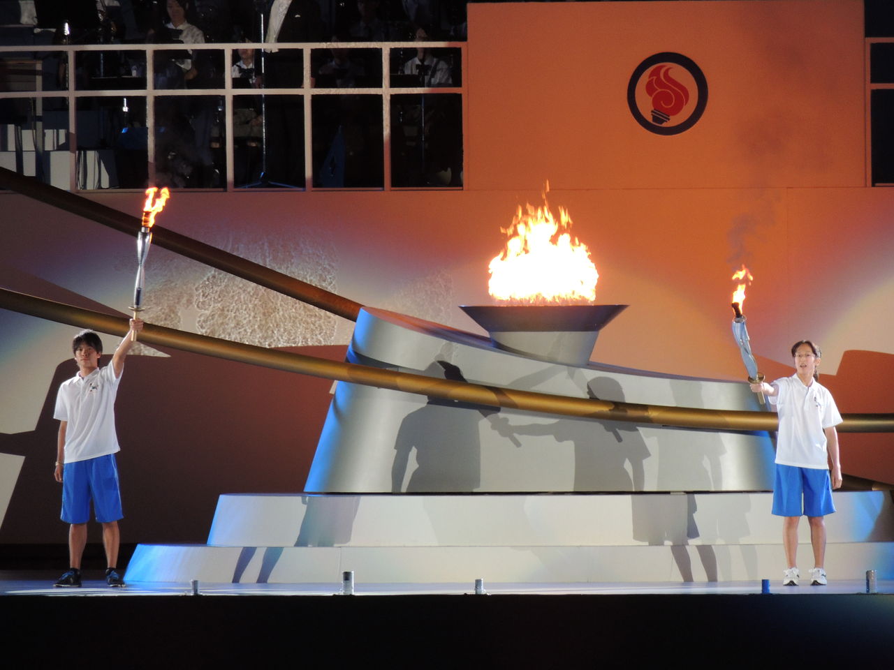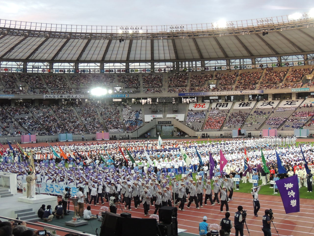 国体開会式は2020年オリンピックを意識して夕刻からの開催となりました。調布の「味の素スタジアム」には両陛下の入退場もあるため早めに到着し、様々なオープニングパフォーマンスを楽しみました。翌日の報道では東京が過度に金をかけた派手な演出を批判するコメントもありましたが中身はほとんどが都民参加のものでプロダクション丸投げの演出とは異なり、「逆に、こんなに違う高校の生徒達がどうやって練習したんだろう?」と感心した程です。