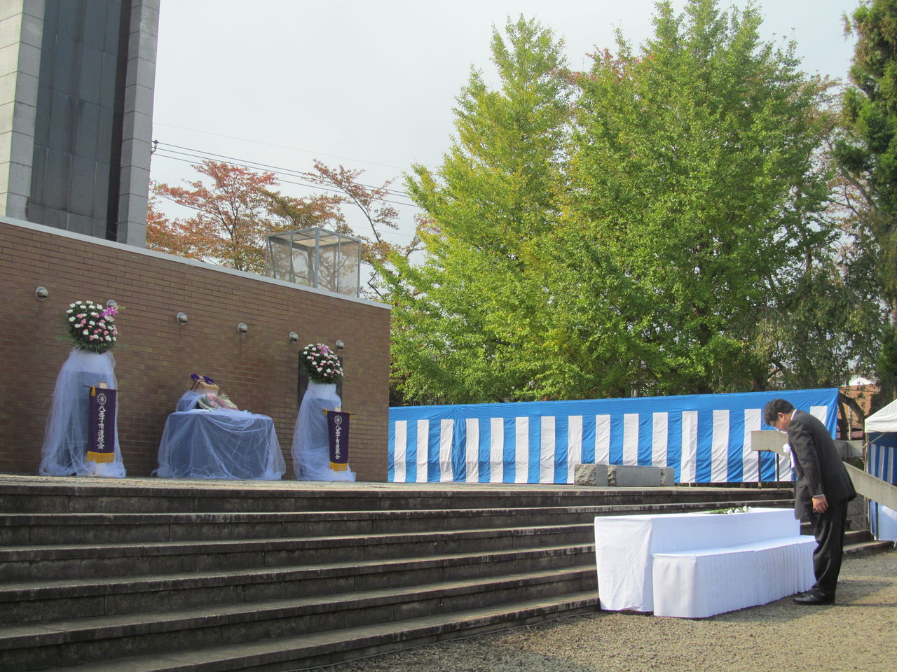 市遺族会の皆さんが主催する戦没者・戦災殉難者を追悼する会が富士森の慰霊塔で行われました。毎年春に行う市主催の慰霊祭も同所で行われていたのですが、近年ご遺族の高齢化が進み、丘の上まで登ってくるのが困難な為、駅前のオリンパスホールで行う事になりました。確かに便利になり出席者も増えたのですがそれでは慰霊塔へ行く人が減ってしまうという危惧から秋に集まれる人だけでも集まろう、となったようです。