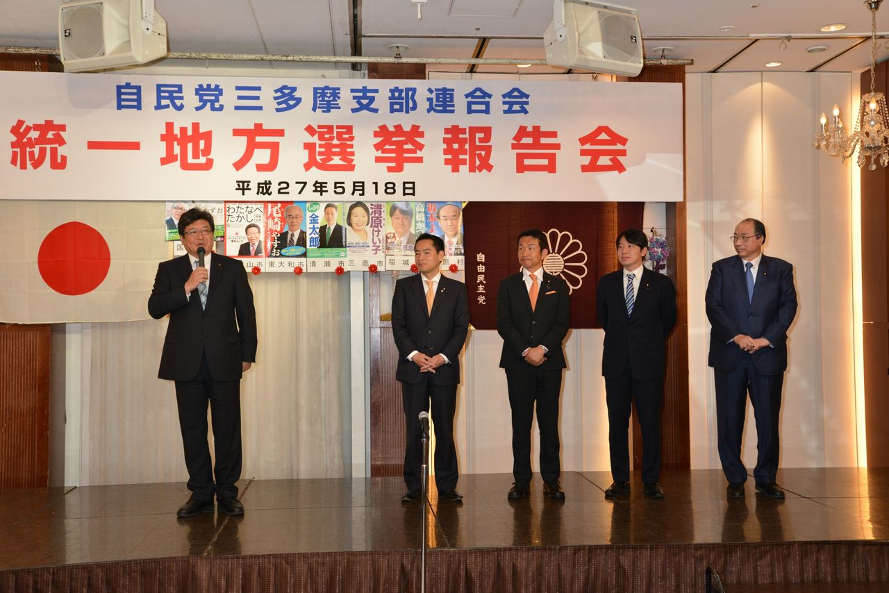 自民党三多摩支部連合会主催の統一地方選報告会が行われ、4年前より21名増えた三多摩中の新議員が集結しました。中央高速が集中工事で使えない為、四ツ谷から中央線に乗りましたら事故で不通となり、慌てて新宿まで移動し京王線―南武線と乗継ぎ、改めて三多摩の鉄道の貧弱さを味わいながらなんとか立川へ。中央線の複々線化はじめ20号バイパスの延伸、横田基地の軍民共用化等、三多摩の共通の課題にこの仲間としっかりと取り組んで行く決意を挨拶で訴えました。又、長い間会長を務めていただいた三田敏哉先生が勇退され、吉野利明新会長にバトンタッチされました。