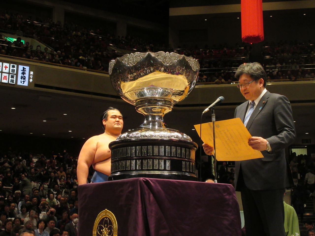 通常は介添人と共に渡す、大きな総理杯を一人で渡したことで場内がどよめきました。リハーサルの段階で八角理事長から「副長官なら大丈夫!」と太鼓判を押されてしまいましたので引くに引けなくなったのが正直なところで、本当は重かったです。