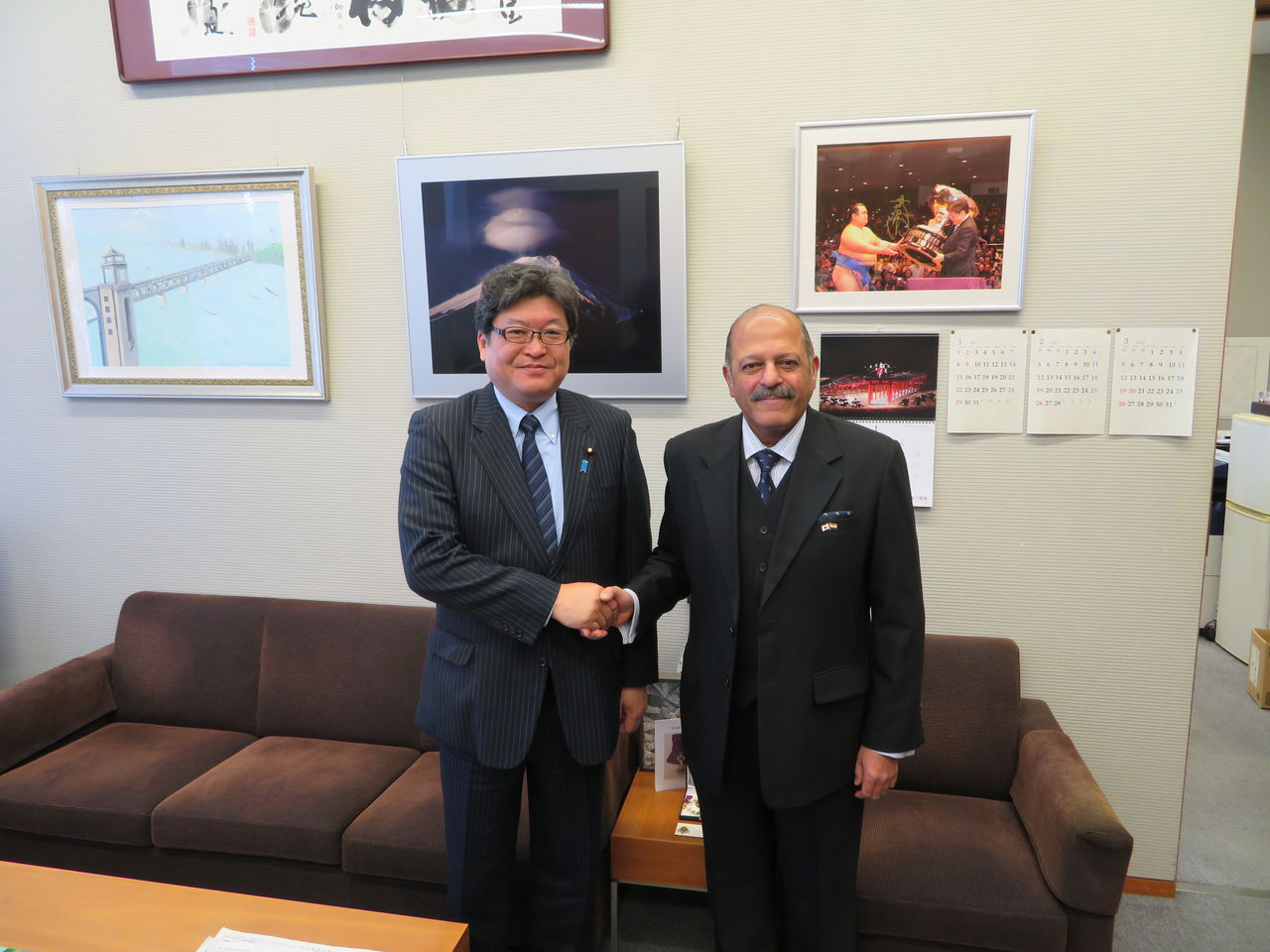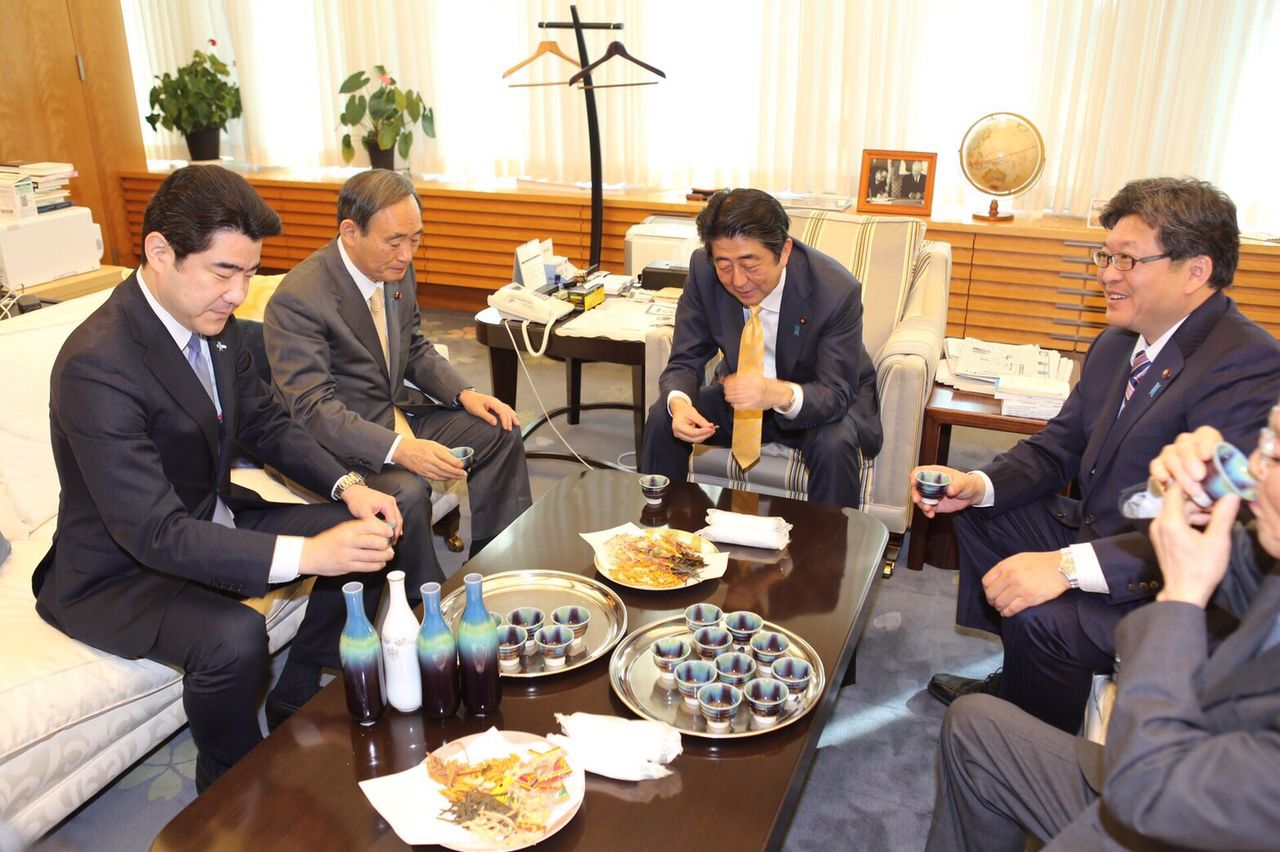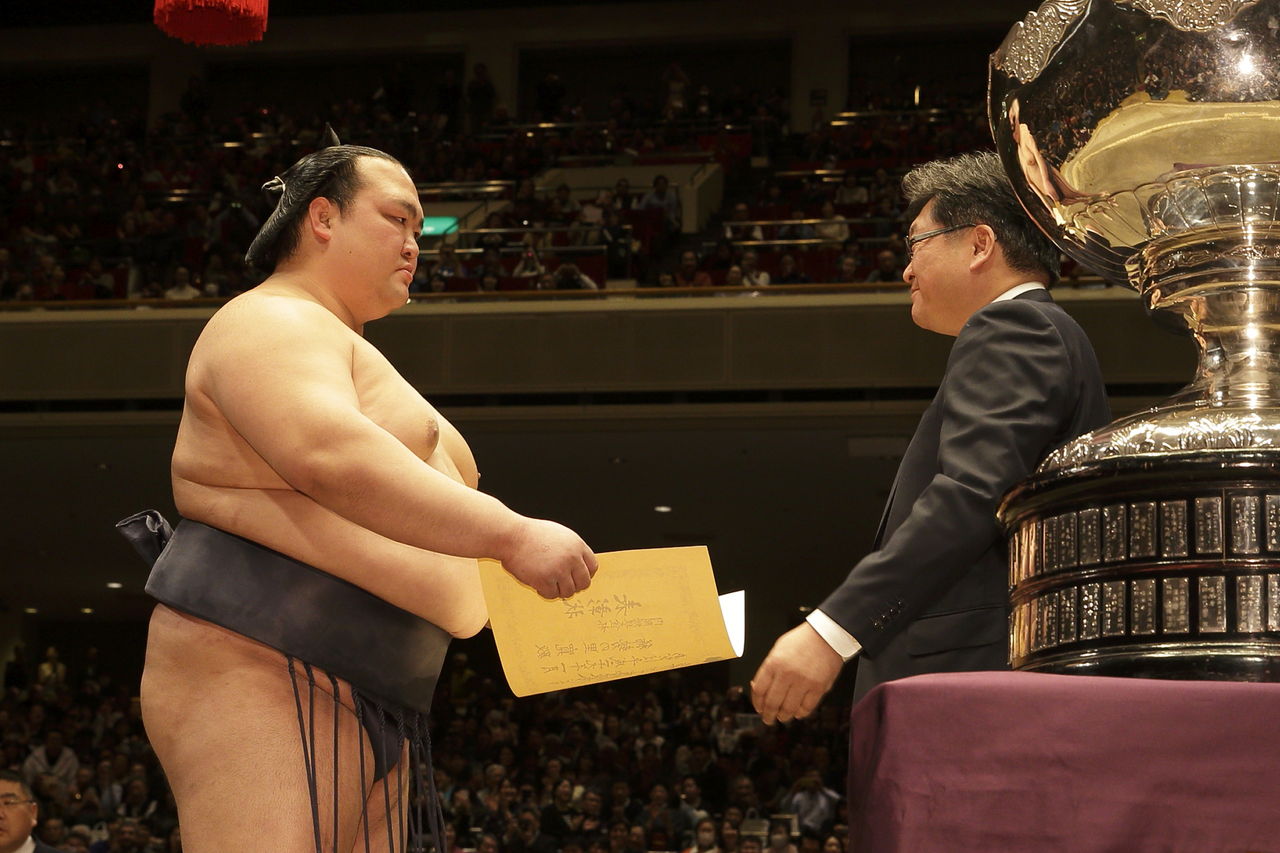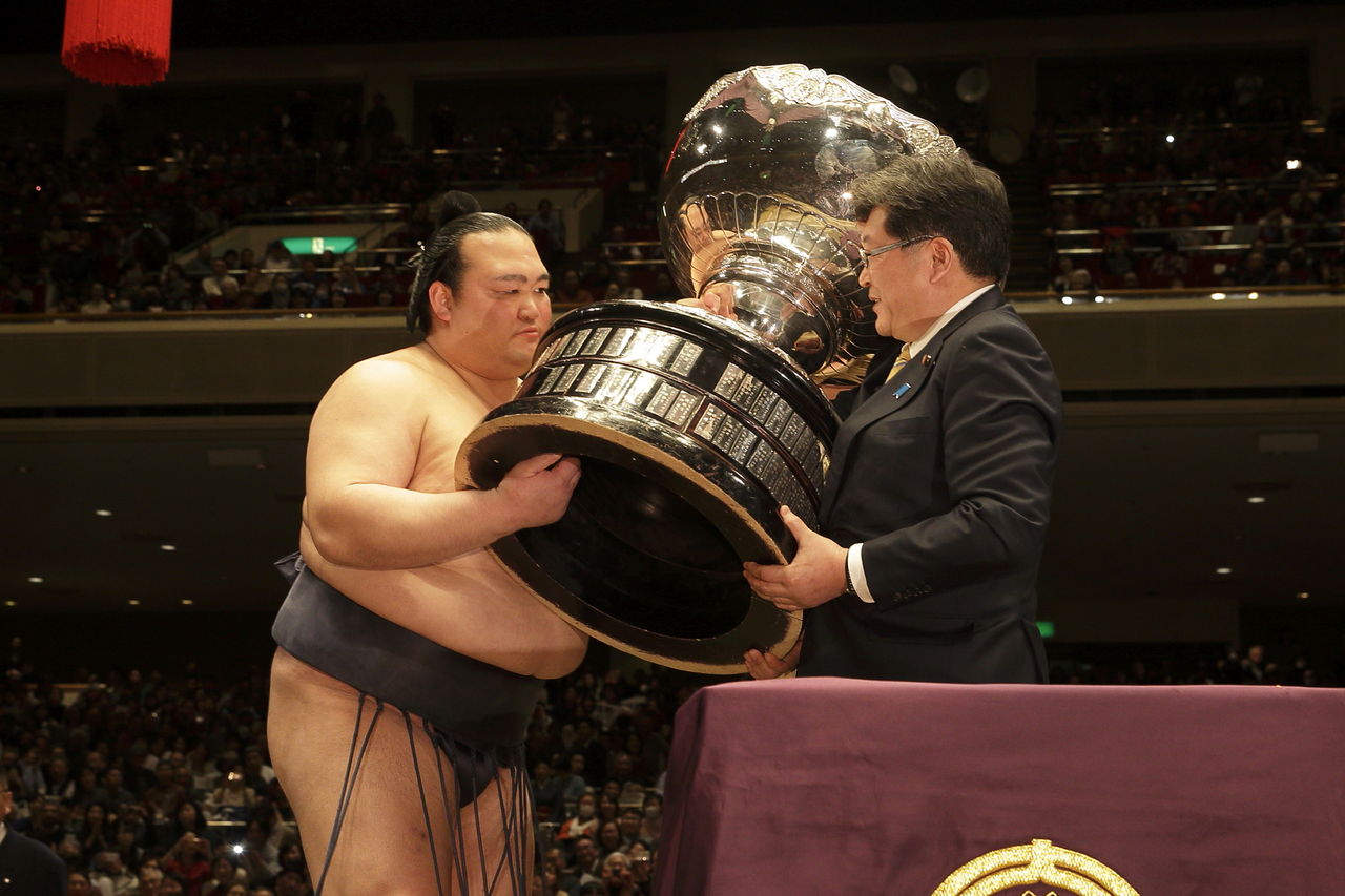 図らずも総理に代わって内閣総理大臣杯を授与する機会を頂きました。私の副長官室にはなぜか、就任時に党の皆さんから頂いた関取の手形の色紙が飾ってあり、日頃から親しみを感じておりましたので、特別な思いで千秋楽の表彰式に臨みました。日本出身力士としては19年ぶりの横綱誕生であり、初場所から15年、徹底した自己管理で稽古を重ね、休場はたったの1回という、真に努力に努力を重ね頂点に登り詰めた苦労人です。新横綱には国民の皆様に夢や希望を与え、角界を盛り上げて頂きたいと祈ります。