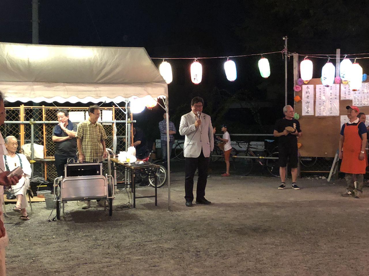 今年の八王子まつりは、熱中症への懸念から「子ども音頭の集い」と「民踊流し」が中止となりました。山車の昼の巡行を控える町会もあり、例年より人出の少ないちょっぴり寂しい開催となりました。実行委員会も悩んだ末でしょうが、36℃の日中、甲州街道は照り返しで40℃近くになり、やむを得ない判断だったと思います。特に150団体4千人を超える踊り手が、それぞれ揃いの浴衣で参加する民踊流しは、一昨年にはギネス世界一に登録されたほどの名物で、沿道は多くの見物客で埋まります。各町会、やや年配のお姉様方も多く参加する為、おじいちゃんと一緒に応援にきたお孫さん達が終了後には夜店を楽しんだり、団体ごとの打ち上げが予定されていたりと経済効果も大なのですが、今年はキャンセル続出で飲食店から悲鳴が聞こえました。私も行く先ざきで皆さんから「来年は時間帯を変えて」とか「散水車を出して」と陳情を受けました。極めつけは千貫神輿。「オリンピックのマラソンコースと同じ遮熱舗装にしてくれ!」と皆さんから大合唱を受け、検討してみると答えましたが・・・。幸い3日間で救急搬送は4名、大事に至らず結果は良かったと思います。久しぶりにお会いする地元の皆さんからは、あちらこちらで激励を頂き心の充電ができた八王子まつりでした。