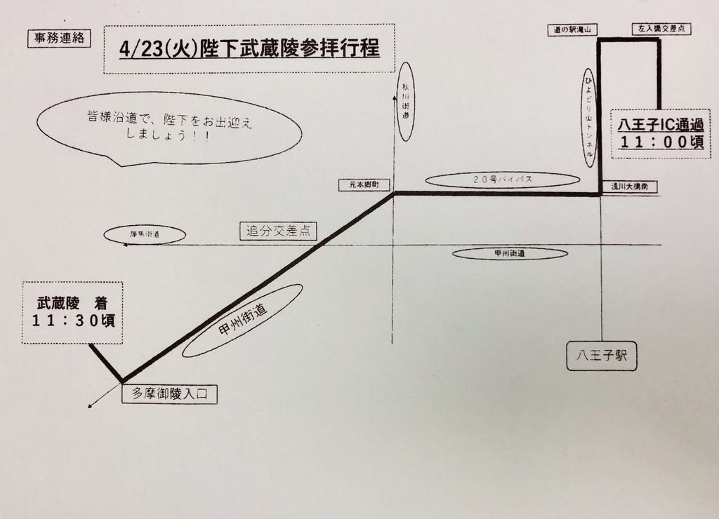 4月23日(火)の天皇陛下の八王子訪問時間は以下の通りです。甲州街道は往路だけですのでご注意ください。