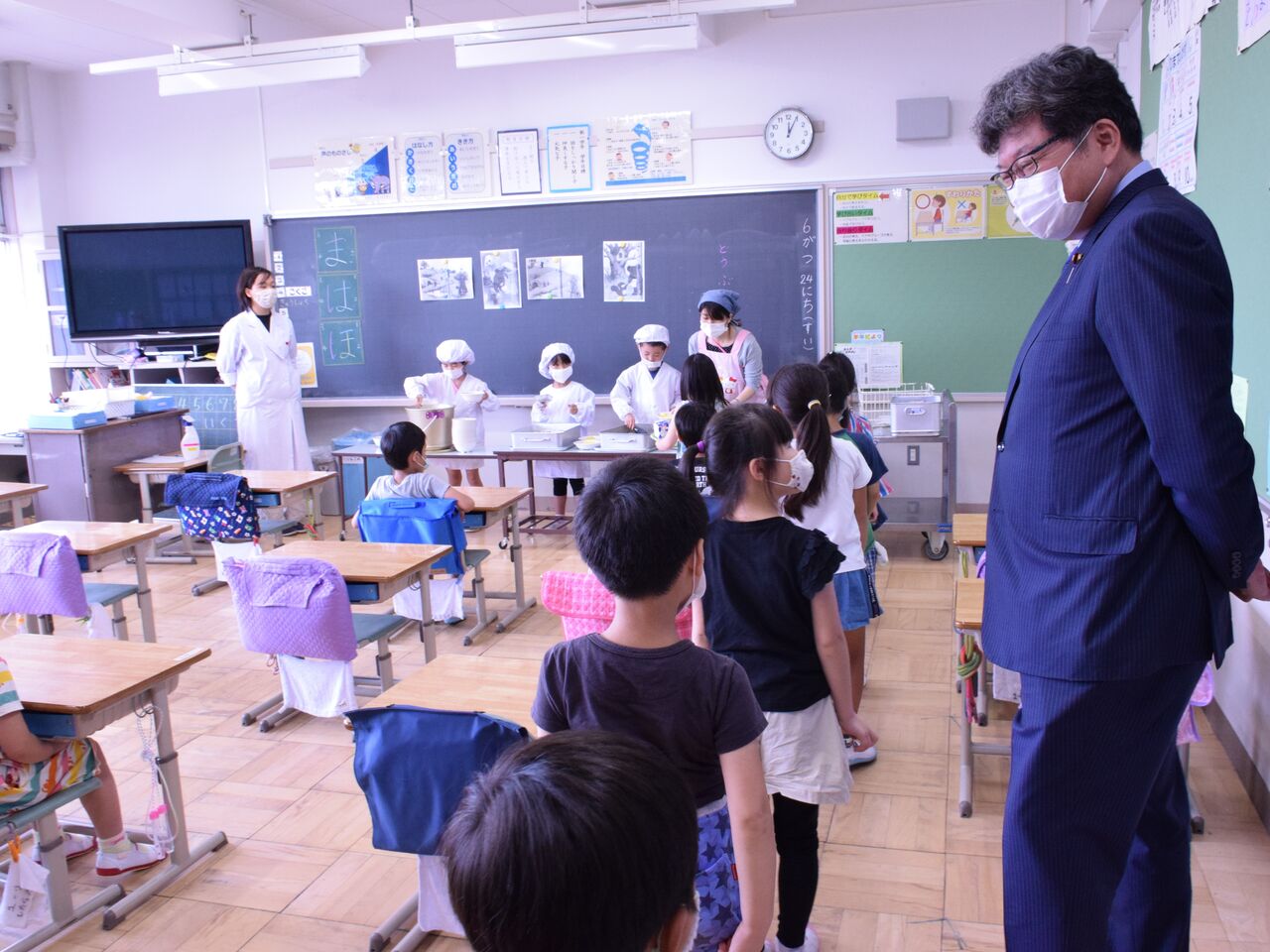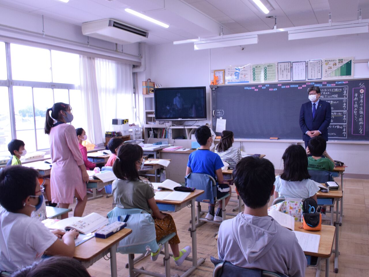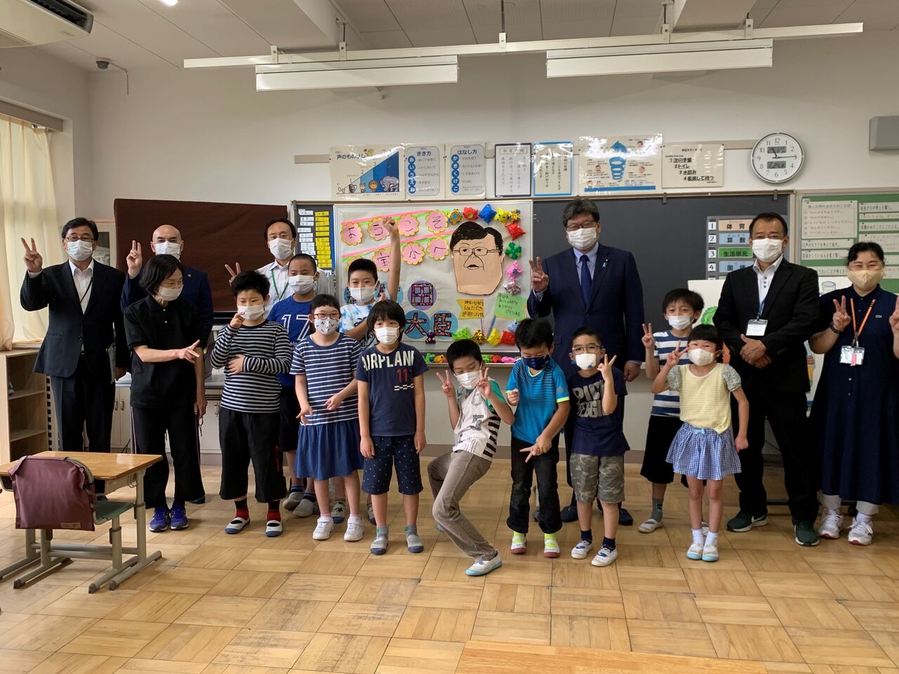 大野校長のリーダーシップのもと、文科省のガイドライン以上に明確に、そして柔軟に感染拡大防止に配慮しながら授業、行事、休み時間、給食など様々な取り組みをすすめている事に安堵しました。特別支援学級の皆さんがウェルカムボードを作って笑顔で迎えてくれたり、6年生の授業では飛び入りで児童の質問に答える一幕も。先生方も子供達も学校再開を待ちわび、当たり前の日常を大切に頑張っていることがひしひしと伝わる素晴らしい学校でした。