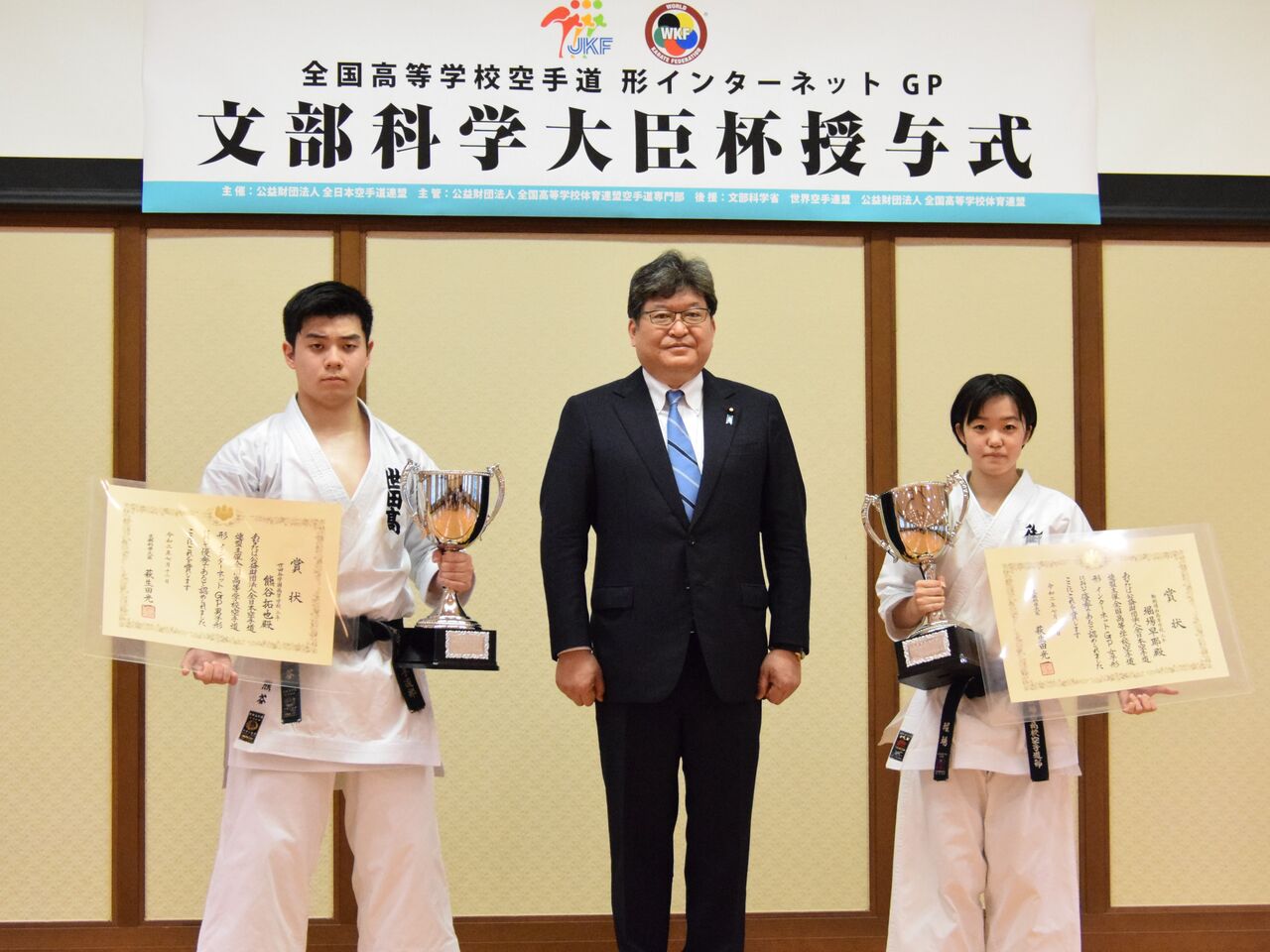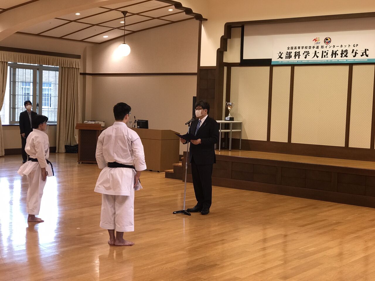 インターハイ等の中止で代替大会を提案した第一号として高校生の空手リモート大会が行われ、文部科学大臣賞の授与式を行いました。男子は熊谷拓也君(世田谷学園高等学校)女子は堀場早耶さん(御殿場西高等学校)の2名です。今後も各競技で様々な取組みを応援します。