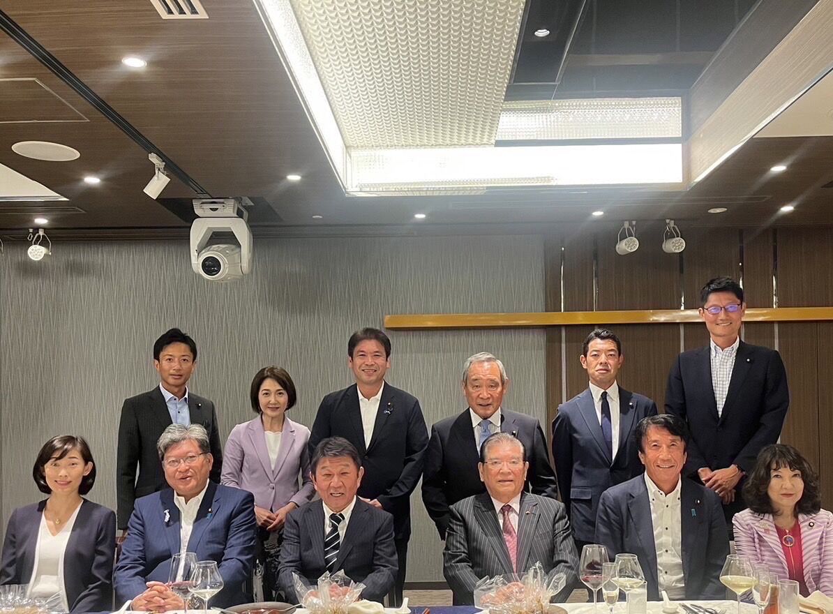 党都連最高顧問の深谷隆司先生にお招きいただき、都連有志メンバーと懇談の機会をいただきました。深谷通産大臣の当時の政務次官が茂木幹事長、秘書官が齋藤法務大臣というご縁もあり、お二人も加わってくれました。私も20代の市議会議員の時代からご縁をいただき、深谷門下の一人としてご指導をいただいてきました。かつて仰ぎ見た深谷都連会長と同じポジションを務めさせていただいていると思うと不思議な気持ちです。今年で米寿を迎えるとの事ですが、切れのある演説は今も変わらず「頑張ってもあと30年しか働けない。後は萩生田君に頼む」と言ってくださいましたが、30年後は私も90歳です。(笑)
