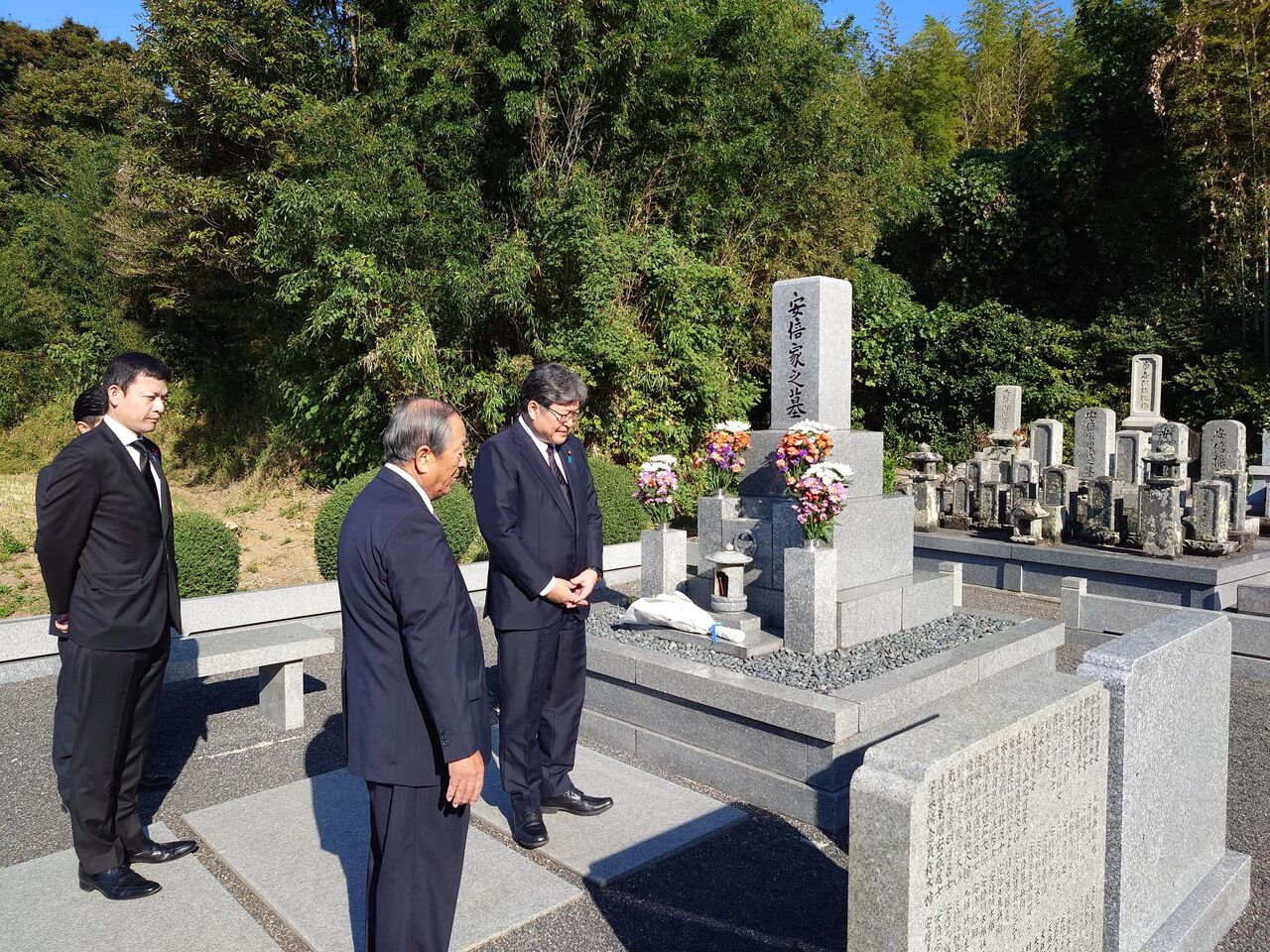 翌日、大分へ移動する前に念願だった安倍元総理のお墓をお参りできました。早朝の訪問でしたが、地元、油谷町の皆さんが大勢出迎えて下さいました。折角ですので、安倍元総理との出会いや思い出を地元の皆さんにお話しさせていただきました。志を引き継いで頑張る事を墓前にお誓いしました。