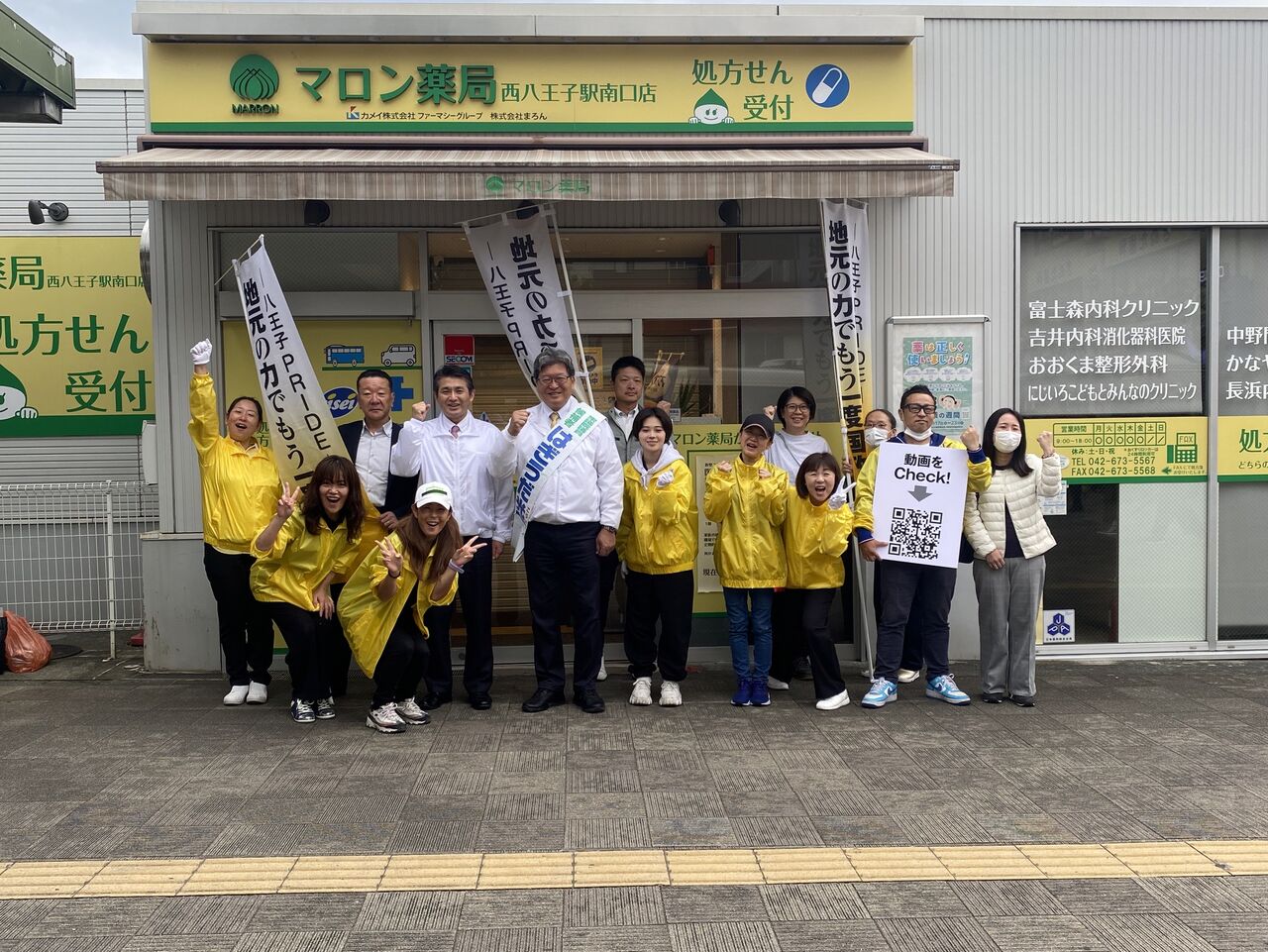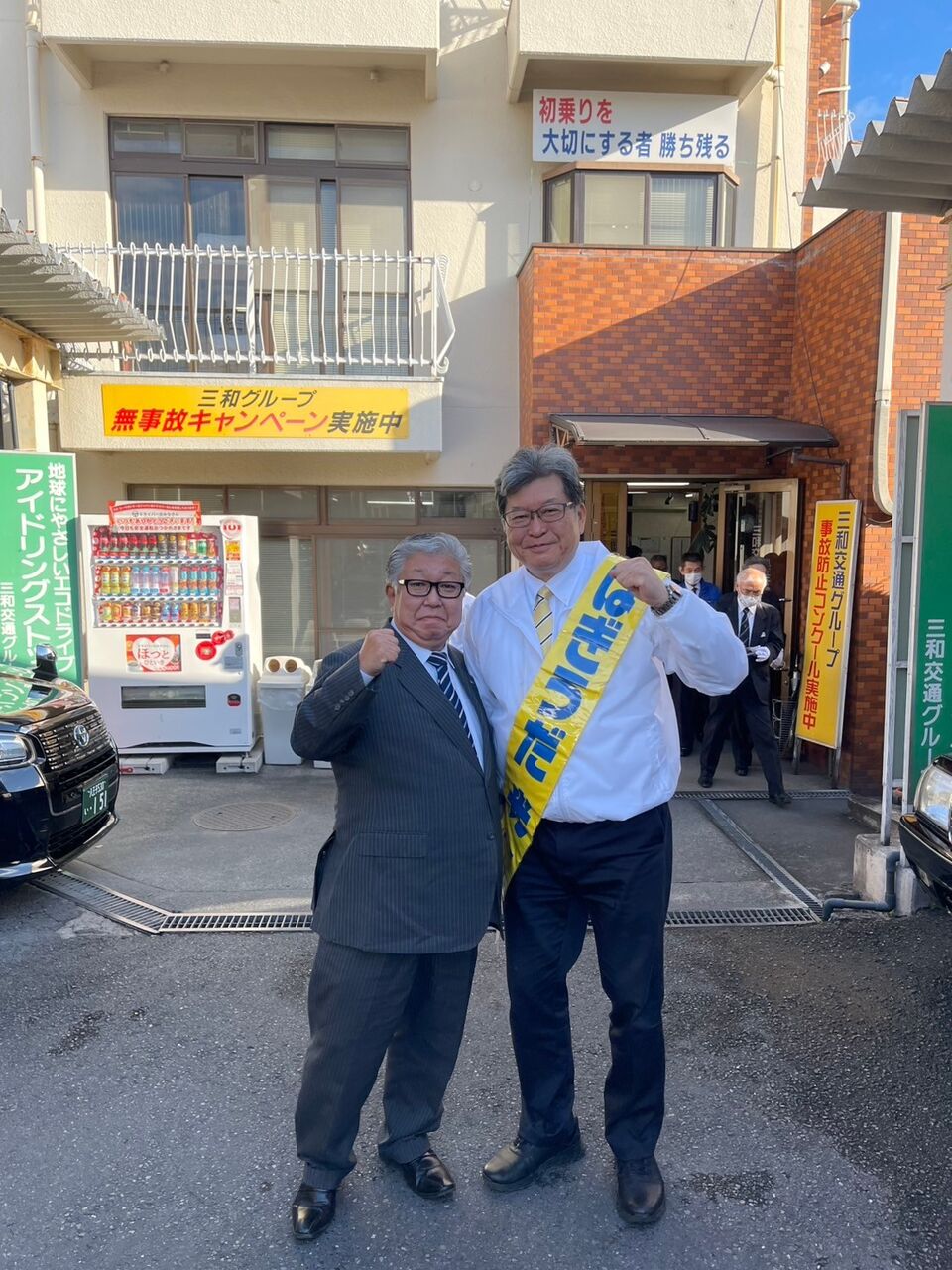 北野駅前からスタートし、怒涛の企業朝礼廻りを行いました。タクシー会社ではTikTokで有名な溝口さんが迎えてくれました。「お互いよく間違えられる」と大笑い。八王子出身の絆で支援も広げていただき感謝です。