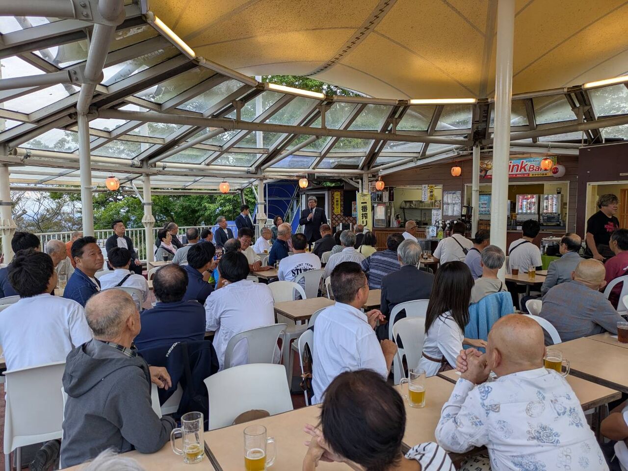 高尾・浅川後援会の納涼会が高尾山ビアマウントで行われ、文字通り涼風の中、皆さんと懇親の機会をいただきました。20年ぶりに山頂の木を伐採した事で再び眺望が広がり、富士山がくっきり見えるようになりました。秋のシーズン終了後はケーブル駅の見晴らし台付近も切ります。国定公園内の木を切るのに間に入る関係省庁が多く、手続きが複雑で毎回時間がかかるので、何もなくても一年に一度、環境省、林野庁、都、市、地元商店会など関係者で情報交換できる仕組みをつくる事としました。
